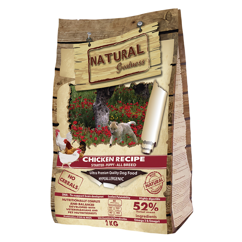 Natural Greatness CHICKEN RECIPE este o reteta excelenta ultra-premium si hipoalergenica formulata fara cereale, destinata cateilor de la intarcare pana la varsta de 12-18 luni. De asemenea, este excelent pentru femelele gestante și care alăptează și pentru adulții de rase mici și mijlocii. Ingredientele sale promovează dezvoltarea musculară și oferă energie pentru creșterea și dezvoltarea corespunzătoare a cățelușului. Toate alimentele noastre sunt preparate folosind un proces natural de gătit extrem de avansat, bazat pe injectarea directă a cărnii proaspete. Calitatea ingredientelor naturale folosite în rețetele noastre le oferă niveluri ridicate de palatabilitate și digestibilitate.