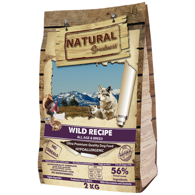 Natural Greatness WILD RECIPE este o rețetă excelentă ultra-premium, hipoalergenică, formulată fără cereale, dezvoltată ideal pentru câini adulți activi, căței, femele gestante sau care alăptează de rase mijlocii și mari sau pentru cei care pur și simplu au nevoie de o nutriție de înaltă calitate. Rețeta încorporează procente mari de carne care ajută la menținerea energiei și a masei musculare. În plus, componentele acestui aliment promovează tranzitul digestiv și ajută la întărirea articulațiilor cățeilor și adulților. Proteinele din cărnurile sale au o valoare biologică ridicată, garantând niveluri ridicate de nutrienți de calitate.