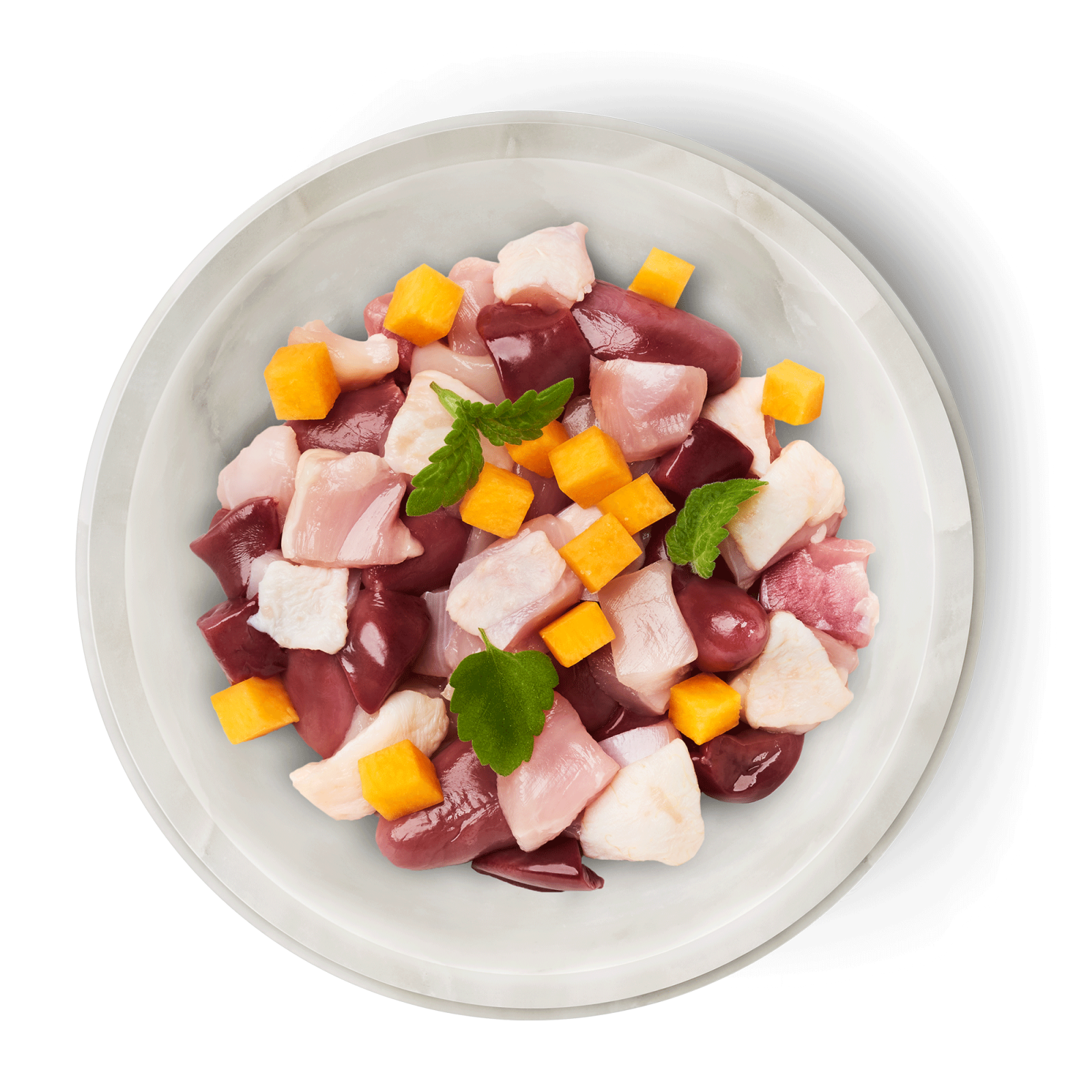 Inimi de pui (40%), piele de pui (20%), stomacuri de pui (12%), picior de pui cu piele (10%), ficat de pui (10%), dovleac (4%), pulbere de roșii*, ulei de rapiță, ulei de pește, valeriană*, minerale (*uscată)