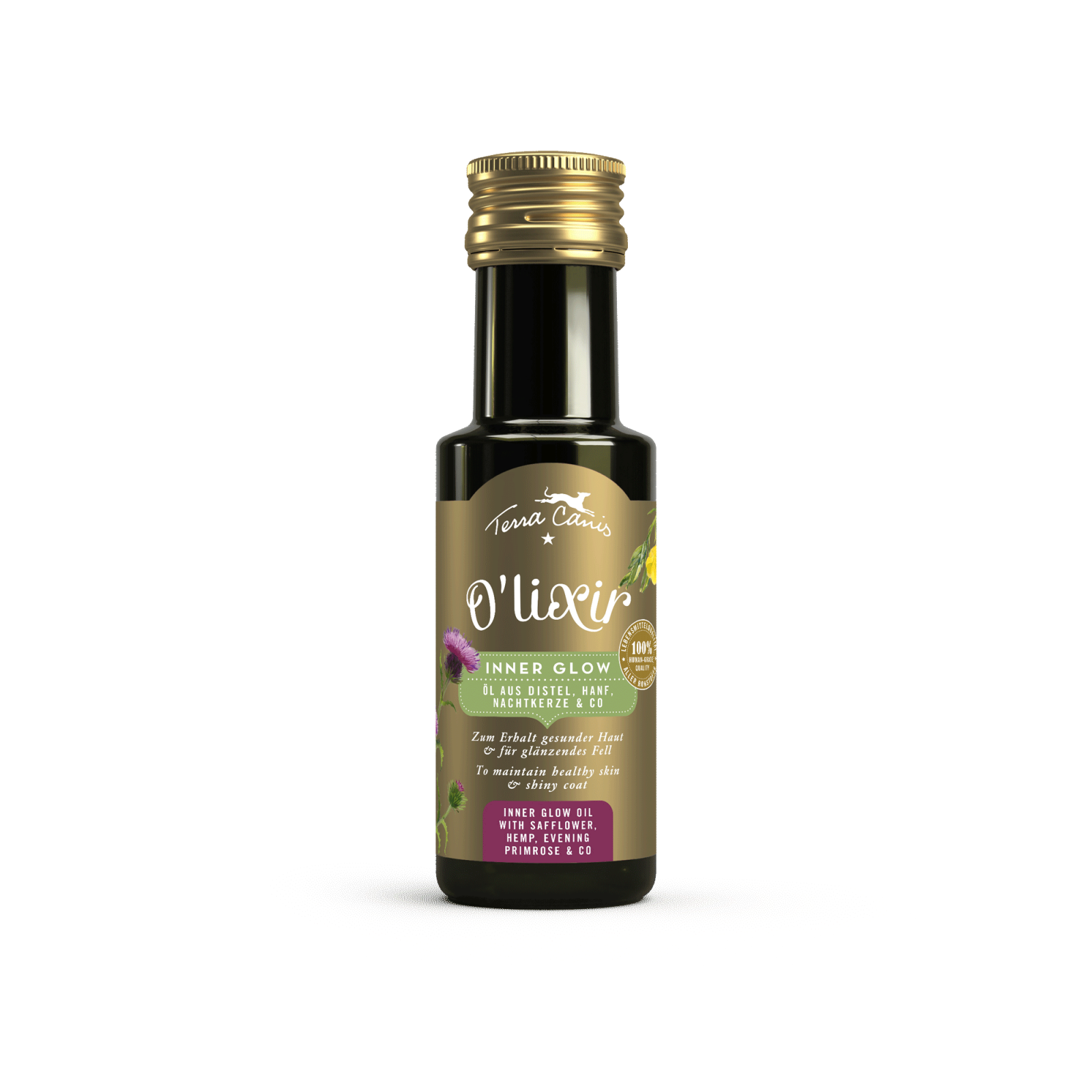 Inner Glow – Uleiul premium pentru câini pentru a susține în mod natural frumusețea din interior. Acest amestec de uleiuri a fost creat din cinci uleiuri vegetale atent selectate: ulei de șofran, semințe de in, cânepă, borage și ulei de primulă. Această combinație specială oferă diverși acizi grași esențiali care joacă un rol important în sănătatea pielii și a blanii. Uleiul de șofrănel, presat la rece din semințe de șofran, este bogat în acid linoleic acid gras omega-6, iar atât uleiul de in, cât și uleiul de cânepă sunt bogate în acidul gras omega-3, acid α-linolenic, care promovează o barieră sănătoasă a pielii, menține hidratarea pielii și contribuie la un strat strălucitor. Uleiul de luminiță și uleiul de borage, ambele bogate în acid γ-linolenic, au proprietăți antiinflamatorii și completează acest amestec eficient.